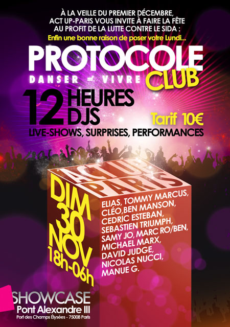 À la veille du 1er décembre, journée mondiale de lutte contre le sida, Act Up-Paris vous invite à faire la fête. Dimanche 30 novembre de 18 heures à 06 heures le lendemain matin PROTOCOLE CLUB / DANSER = VIVRE 12 heures / 12 DJs : Elias, Tommy Marcus, Cléo, Ben Manson, Cédric Esteban, Sébastien Triumph, Samy Jo, Marc Ro/Ben, Michael Marx, David Judge, Nicolas Nucci, Manue G Live shows, surprises, performances… Au ShowCase, pont Alexandre III, Port des Champs-Elysées, Paris 8ème