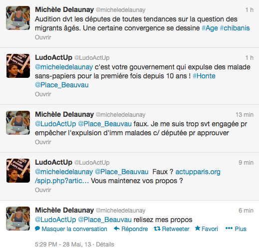 Plus odieux par son cynisme que la droite par sa brutalité, le gouvernement socialiste est le premier depuis le début des années 2000 à expulser sciemment des étrangEREs malades[[https://www.actupparis.org/spip.php?article5137]]. Plus soucieuse de solidarité gouvernementale que de la survie des personnes, Michèle Delaunay préfère faire comme si de rien n’était[[https://twitter.com/micheledelaunay/status/339401385525272576 puis https://twitter.com/micheledelaunay/status/339403085015302145]]. Et condamner à mort les malades expulséEs.
