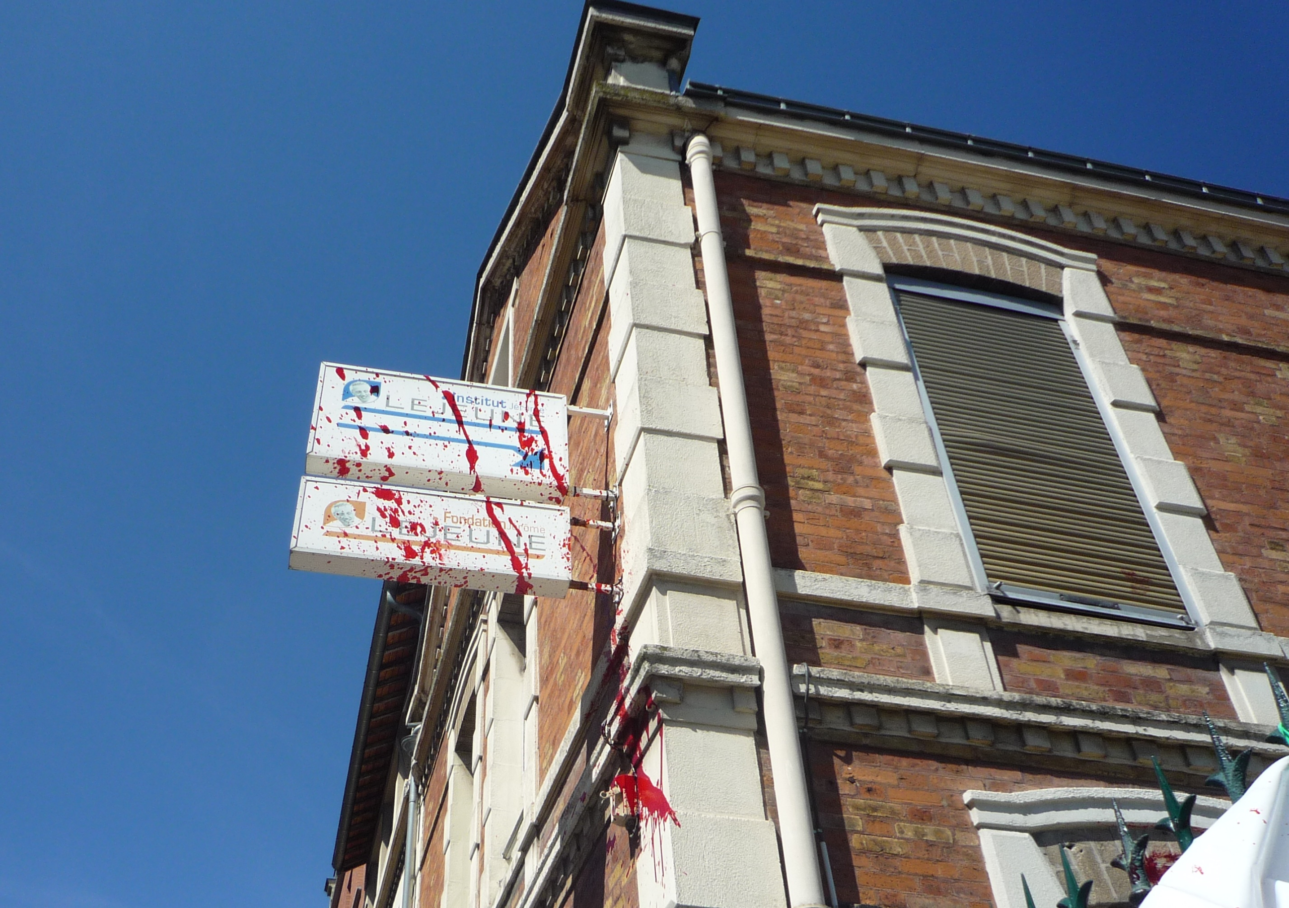 Nos militantEs ont déversé du faux sang devant les locaux de la Fondation Jérôme Lejeune, symbole du vrai sang de nos soeurs qui coule en Russie et que la « Manif Pour Tous » et ses soutiens voudraient à nouveau voir couler en France.