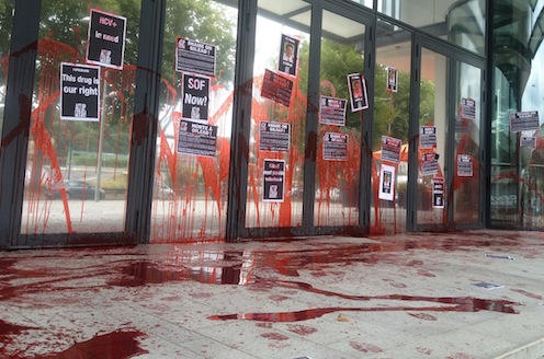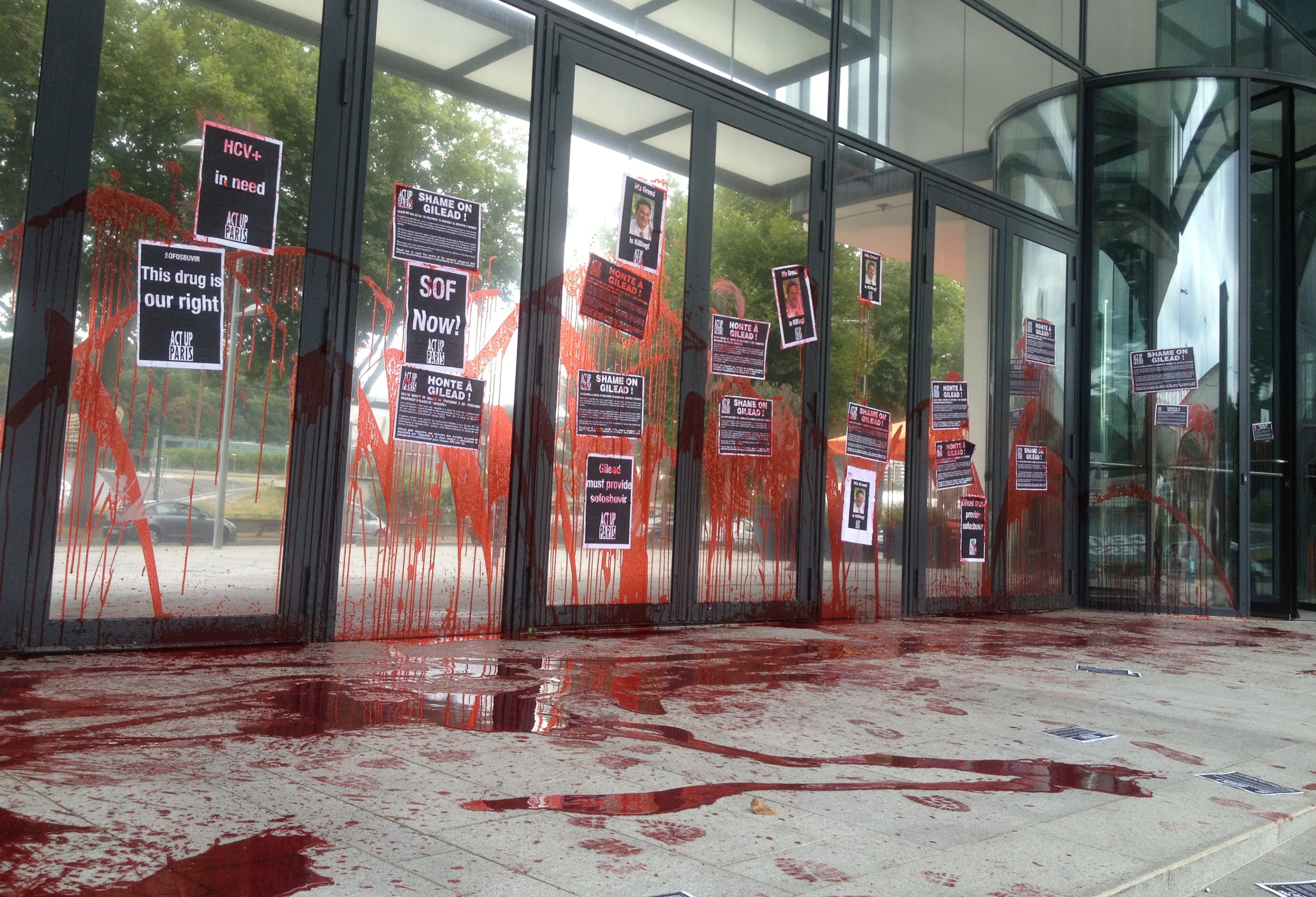 HCV : Shame on Gilead ! People living with HCV who are in an urgent need of new treatments should ge t an early access to compounds that are in nearing approval, and therefore not yet on the market. In France, there is an early access system, called ATU (Temporary Authorization of Use), to allow for early access to potentially life-saving drugs. At noon today, the activists of Act Up-Paris went to Boulogne-Billancourt to the French headquarters of Gilead Sciences Inc. to remind the company that it must follow the advice of the French national regulation agency of drugs ANSM (Agence Nationale de Sécurité du Médicament). Gilead refuses to give early access to sofosbuvir (SOF) to 60% of patients who received a name based ATU because they are in therapeutic impasse with molecules currently available on the market. The activists put up posters on the French headquarters of the firm,poured fake blood, unfurled a banner « Shame on Gilead » and shouted slogans such as « SOF is our right » or « We need this drug. ». The attitude of Gilead is denounced by several patient groups and national and international coalitions like TRT-5, CHV, Treatment Action Group (USA) and the European AIDS Treatment Group (EATG). An online petition has collected more than 400 signatures. Laure Pora, president of Act Up-Paris, said: « For Gilead, monopolistic logic is more important than therapeutic requirements; compassionate access to sofosbuvir is not the only example. We ask members of the Economic Committee of Health Products, who set the prices of drugs to financially penalize the firm when time comes to fix the price of sofosbuvir and we call for politicians to denounce the attitude of Gilead. We ask every organisation and people to sign the online petition.  » Act Up-Paris requires Gilead Sciences to immediately provide the sofosbuvir to all persons who have a name based ATU.