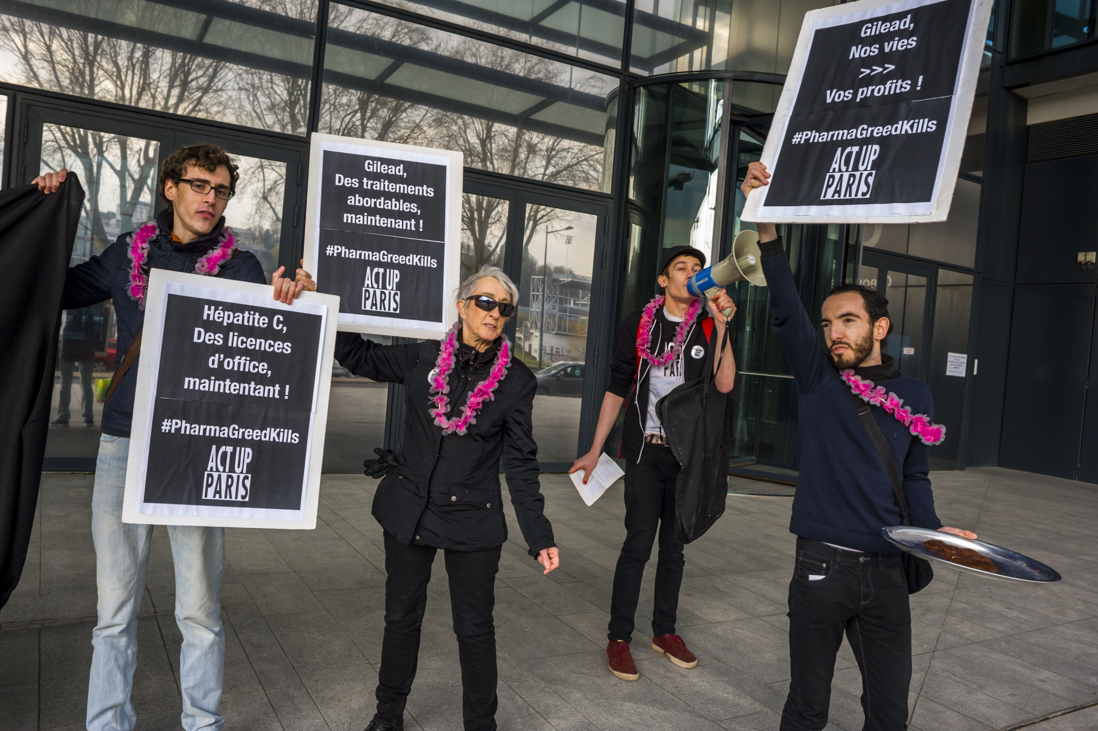 Paris, France, AIDS Activists, Act UP protest against Gilead Pharmaceuticals, to lower drug prices, 1/4/16, front of Gilead France offices