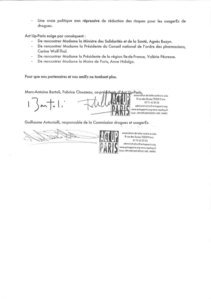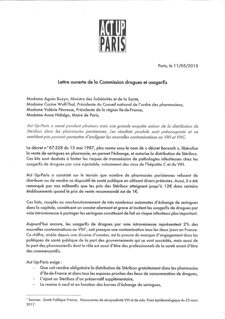 Lettre ouverte d’Act Up-Paris Commission drogues et usagerEs