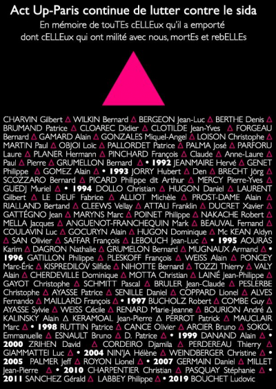 40 ans après, n’oublions pas touTEs nos mortEs du sida, nos luttes passées et actuelles et n’oublions pas que le combat continue avec et aux cotés des personnes vivant avec le VIH. Il est temps que nous ayons aussi notre mémorial pour toutes les personnes décédées du sida pour que nous puissions nous recueillir et honorer leur mémoire, comme c’est le cas à New York, à Berlin et récemment à Londres. Il est temps que le centre d’Archives LGBTQI+ voit enfin le jour pour en faire un lieu de transmission, de mémoire et d’information de la lutte contre le VIH-sida et des luttes contre les discriminations LGBTQI+, ouvert à touTEs, et notamment aux concernéEs