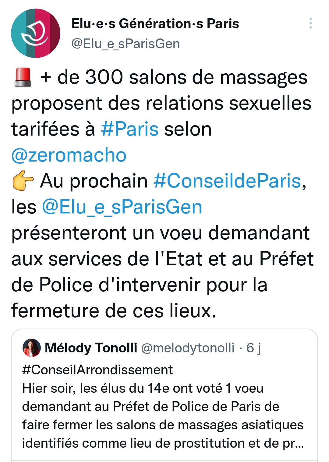 Au #ConseilDeParis est proposé un vœux prohibitionniste, sans concertation des personnes concernées. Les #TDS asiatiques vont être réprimées, sans ouverture de droits, repoussées de l’accès au soin et plus exposées aux violences. Que vont faire le et Raphaëlle Rémy-Leleu ?