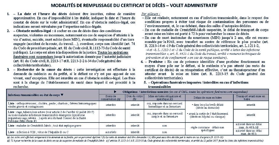 Pour les soins de conservation et le don du corps à la science, un rappel est fait au verso du formulaire sur quelles maladies conditionnent une interdiction de ces pratiques. Si pour le VIH et les hépatites virales, les soins de conservations ne sont plus interdits contrairement aux autres maladies, le don du corps à la science reste interdit (notamment dans le cadre du don d’organe). Cette interdiction du don à la science peut être une indication pour le thanatopracteur que le cadavre est porteur du VIH ou d’une hépatite virale, si ce n’est pas écrit dans les causes du décès.