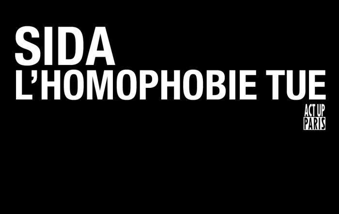 Act Up-Paris est une association de lutte contre le VIH-Sida issue de la communauté homosexuelle. Elle rassemble des séropositifVEs, des militantEs concernéEs par la maladie, des hommes, des femmes, lesbiennes, gays, biEs, trans, hétéros, pour qui le sida n’est pas une fatalité. Nous pensons que des réponses politiques doivent être apportées à cette épidémie, vaincre le sida n’est pas du seul ressort de la médecine.