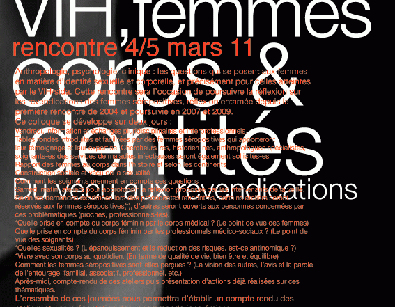 Le prochain colloque national se déroulera sur 2 jours et abordera les questions relatives à la perception du corps et des identités des femmes vivant avec le VIH. Cette rencontre sera l’occasion de poursuivre la réflexion entamée depuis les premiers Etats Généraux de 2004 et poursuivie en 2007 et 2009, visant à élaborer des revendications à partir de l’expérience et du vécu des femmes concernées par le VIH.