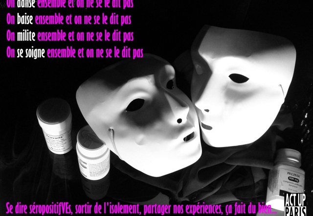 Face à l'exclusion familiale, professionnelle ou affective, tout le monde n'a pas les moyens aujourd'hui de dire sa séropositivité. Pourtant vous n'êtes pas seulEs. A titre d'exemple, un homo sur cinq fréquentant des lieux communautaires à Paris est séropositif (Enquête Prévagay de 2009). Que ce soit dans les bars, dans les clubs, sur le net, dans les assos, dans les salles d'attente à l'hôpital, avec nos amiEs, nos amantEs, ou même avec l'inconnuE en face de nous,