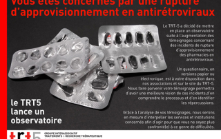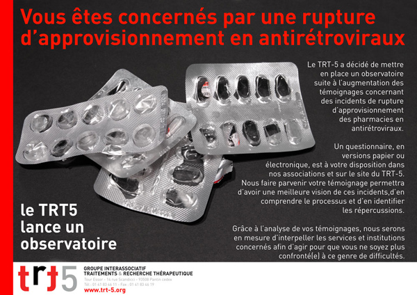 Le TRT-5, collectif d’associations de lutte contre le VIH/sida[[Le TRT-5, groupe d’action sur les Traitements et la Recherche Thérapeutique, réunit des membres des associations Actif Santé, Actions Traitements, Act Up-Paris, Act Up Sud Ouest, AIDES, Arcat, Dessine-Moi Un Mouton, Sida Info Service, Sol En Si, Nova Dona.]], s’inquiète de l'augmentation du nombre de témoignages de personnes vivant avec le VIH ne pouvant se procurer leur traitement antirétroviral pour cause de ruptures d'approvisionnement dans les pharmacies. Afin d’identifier les causes de telles situations, il lance un dispositif de recueil des données.