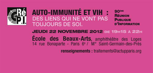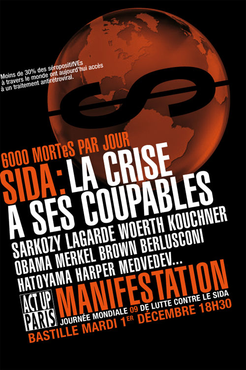 Le 1er décembre, à l’occasion de la journée mondiale de lutte contre le sida, Act Up-Paris appelle les dirigeantEs des pays riches à renforcer leur contribution financière à la lutte contre la pandémie dans les pays pauvres. Une manifestation pour l’accès universel aux traitements partira de la place de la Bastille à Paris à 18h30 (affiche ci-jointe).