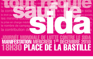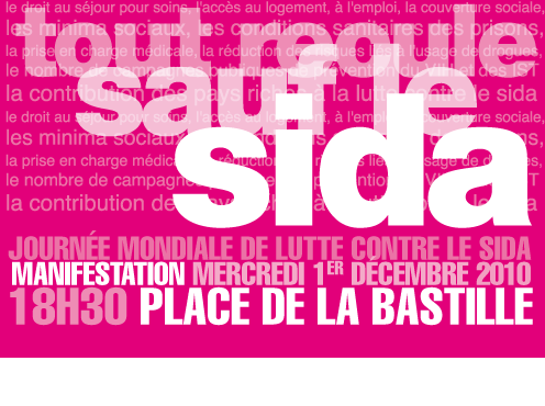 Manifestation à l'appel d'ACT UP-PARIS, ACADEMIE GAY ET LESBIENNE, ACCEPTESS-T, ACTIF SANTÉ, ACTIONS TRAITEMENTS, AIDES, ALS, ANGEL 91, ARCAT, ATENA, Centre LGBT PARIS–IDF, CONTACT PARIS-IDF, CHRÉTIENS & SIDA, COMEDE, DAVID ET JONATHAN, DIAGONALE IDF, ELCS, ENSEMBLE POUR UNE SANTE SOLIDAIRE, GISTI, HOMOSFERE, INTER LGBT, KIOSQUE INFOS SIDA ET TOXICOMANIE, LE MAG, MOBILISNOO, OUTRANS, LES PETITS BONHEURS, PARI-T, LE PLANNING FAMILIAL, RAAC/SIDA, RAINBHOPITAL, LE REFUGE, SIDA INFO SERVICE, SIDACTION, SOLIDARITE SIDA, SOLTHIS, TJENBÉ RED, UNALS et les signatures de : CENTR'EGAUX, EUROPE ECOLOGIE - LES VERTS, FIER-E-S ET REVOLUTIONNAIRES, HES, LE PARTI DE GAUCHE