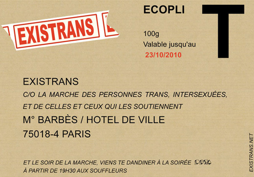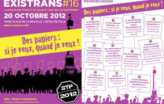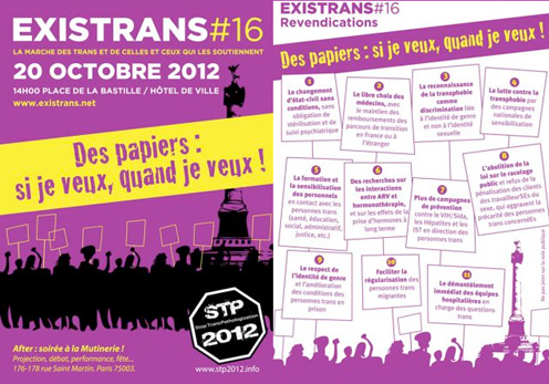 La 14e édition de l'Existrans - la marche des trans, des intersexué.e.s et de celles et ceux qui les soutiennent - a lieu le samedi 23 octobre à Paris, en lien avec la campagne internationale Stop Trans Pathologization 2012 [[Cette année le collectif Existrans s'aligne sur la campagne internationale Stop Trans Pathologization 2012 (STP 2012)* qui a pour but de promouvoir une dépathologisation de la transidentité dans le manuel américain de référence pour les psychiatres dans le monde entier, le DSM, dont la sortie de la 5ème édition aura lieu en 2012.]]