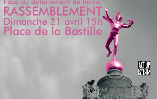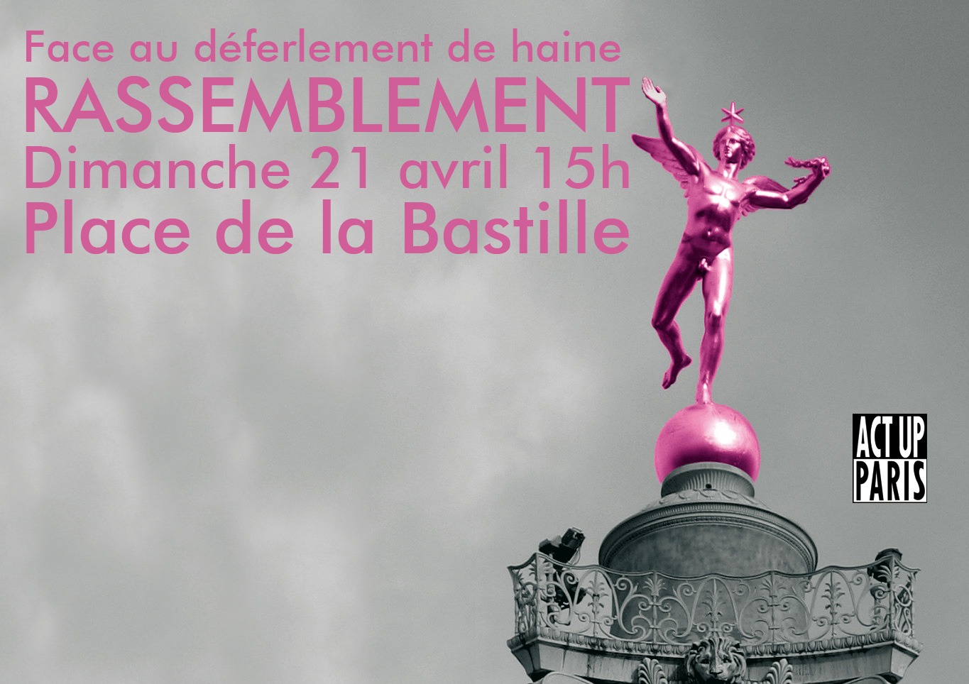 Act Up-Paris appelle à un rassemblement ce dimanche 21 avril 2013 à 15h à Paris, place de la Bastille. Face au déferlement de haine qui s'abat sur l'ensemble des gouines, des trans, des biEs, des pédés, nous réclamons l'égalité des droits.