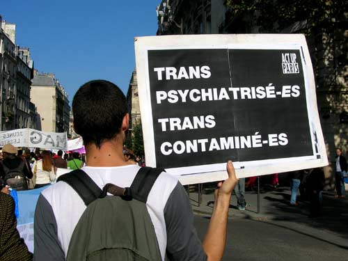 La 14e édition de l'Existrans - la marche des trans, des intersexué.e.s et de celles et ceux qui les soutiennent - a lieu le samedi 23 octobre à Paris, en lien avec la campagne internationale Stop Trans Pathologization 2012 [[Cette année le collectif Existrans s'aligne sur la campagne internationale Stop Trans Pathologization 2012 (STP 2012)* qui a pour but de promouvoir une dépathologisation de la transidentité dans le manuel américain de référence pour les psychiatres dans le monde entier, le DSM, dont la sortie de la 5ème édition aura lieu en 2012.]]
