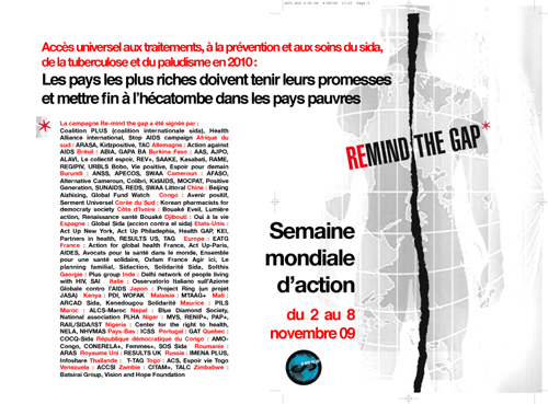 Les associations luttant pour l’accès à la santé dans les pays du sud appellent aujourd’hui à une semaine mondiale d’actions du 2 au 8 novembre 2009, pour exiger des pays les plus riches, dont la France, qu’ils tiennent leurs engagements pour l’accès universel aux traitements d’ici 2010 ; ils doivent notamment augmenter d’urgence leur contribution au Fonds Mondial de lutte contre le sida, la tuberculose et le paludisme. Ces associations réunies autour de la campagne Remind de gap rencontreront Nicolas Sarkozy et Carla Bruni Sarkozy à l’Elysée mercredi prochain le 16 septembre pour aborder la question du financement de la lutte contre le sida, la tuberculose et le paludisme.