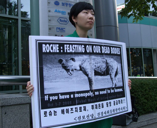 Parce qu'il détient un brevet qui lui permet d'avoir un total monopole sur le Fuzeon®, un traitement antirétroviral inhibiteur de fusion, le laboratoire Roche préfère laisser sans traitement les personnes vivant avec le VIH/sida en échec thérapeutique en Corée du Sud, plutôt que de réduire le prix de ses médicaments. L'avidité de l'industrie pharmaceutique est sans honte et sans limites.