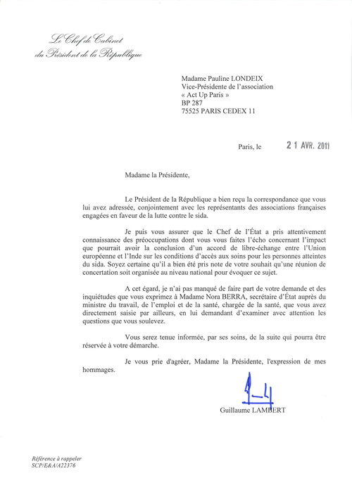 Le sommet du G8 se tiendra en mai prochain à Deauville sous la présidence française. Ce jeudi 7 avril 2011, le Président de la République et Christine Lagarde ont reçu des ONG (dont Greenpeace Act Up-Paris, Médecins sans frontières, Oxfam-France, Sidaction) lors d'une réunion de travail pré-G8. À l’occasion de cette réunion, les associations se sont exprimées sur les questions de transparence de redevabilité et de financement de la santé. Act Up-Paris s'est exprimé pour rappeler l'importance du soutien aux médicaments génériques, qui sont actuellement fortement menacés par la politique menée par les pays riches et en particulier par la France.