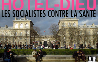Le démantèlement de l'Hôtel-Dieu est une déclaration de guerre faite aux malades. Act Up-Paris appelle le gouvernement PS-PRG-EELV à faire machine arrière. Cette décision pèsera lourd aux prochaines municipales. Que les socialistes qui ont un peu à cœur les intérêts des malades se fassent enfin entendre.