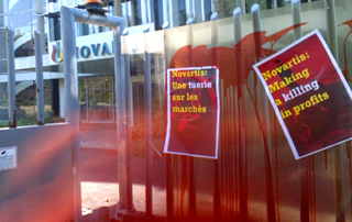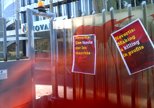 Aujourd’hui, Act Up-Paris a zappé le siège français du laboratoire Novartis à Rueil Malmaison, en banlieue parisienne. Les activistes ont bloqué l’entrée du bâtiment et ont cadenassé le portail. Ils et elles ont déployé une banderole sur laquelle était écrit “Over our dead bodies” (“sur nos corps morts”), recouvert l’entrée de faux sang et ont scandé des slogans tels que “Shame, shame, shame on Novartis” (“honte, honte, honte à Novartis”). Novartis a décidé d'appeler le police. Cette action visait à dénoncer la politique menée par le laboratoire suisse qui poursuit actuellement devant la cour de New Delhi le gouvernement indien.
