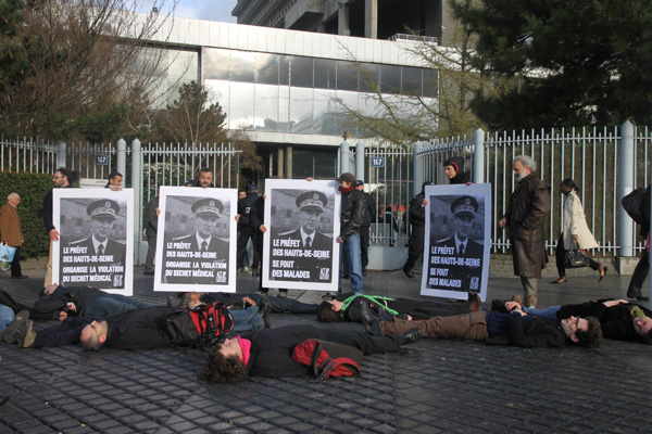 Act Up-Paris a manifesté ce mercredi 31 mars à Nanterre devant la Préfecture. Une vingtaine d'activistes ont brandi des portraits géants du préfet, Patrick Strzoda, avec les slogans "Le préfet des Hauts-de-Seine organise la violation du secret médical" et "Le préfet des Hauts-de-Seine se fout des malades" avant de s'allonger sur le sol. Act Up-Paris manifeste ainsi sa colère face à la malveillance du préfet des Hauts-de-Seine qui transgresse depuis plusieurs années la loi sur la régularisation pour raison médicale et bafoue donc les droits des étrangerEs malades.