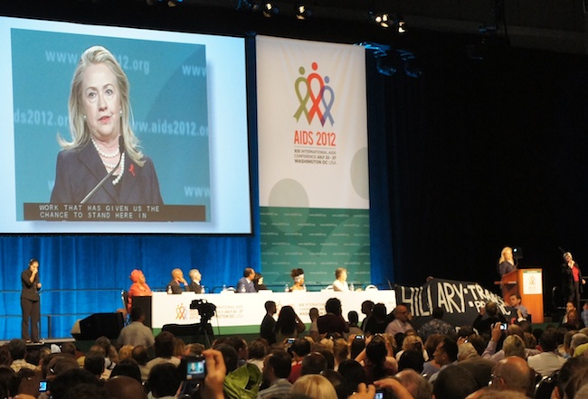 Ce lundi matin, un groupe d'activistes – dont des militants d'Act Up-Paris – a interrompu le discours de la secrétaire d'Etat américaine Hillary Clinton pour l'interpeler sur l'accord trans-pacifique TPP[[Trans-Pacific Strategic Economic]] Partnership Agreement actuellement négocié par les Etats-Unis[[L'accord est pour l'instant négocié avec l'Australie, la Malaisie, le Pérou et le Vietnam mais a pour vocation [...]