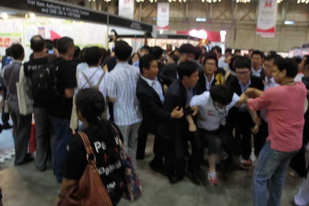 Police beat and arrested South Korean activists, among them people living with HIV/AIDS, during a PEACEFUL march in Busan against Free Trade Agreements. The march took place within the Convention Center. People were ruffed up and got hurt in this process. Even though the protest was not disrupting any activities of ICAAP still plainclothes government security staff considered them as threat and arrested them. Some of the activists are badly hurt while stopping the police arresting their colleagues. See the attached the pictures that show how badly the Korean activists were treated by the Security and the Police.