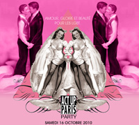 Act Up-Paris vous invite à participer à l’événement LGBT de l’automne 2010 : "Amour, Gloire et Beauté pour les LGBT" le samedi 16 octobre 2010 à partir de 23H au Point Éphémère (200 quai de Valmy, Paris 19, métro Jaurès).