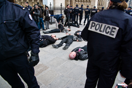 Une trentaine de militantEs d'Act Up-Paris ont effectué ce dimanche 22 mars à 12h30 un die-in à la sortie de la messe à Notre-Dame de Paris pour symboliser les mortEs du sida directement imputables aux positions de l'église catholique à l'égard du préservatif. Notre-Dame a fermé rapidement ses portes : les fidèles n'ont pas eu à les enjamber. Un attroupement de jeunes catholiques intégristes en a profité pour déverser sa haine en criant « la capote c'est la mort, le pape n'a pas tort », « Act Up assassin », « Crevez-en vite du sida » et en lançant des oeufs et des sacs d'eau sur les militantEs étenduEs au sol.